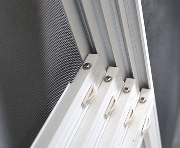 The WEATHERWALL system uses a 4-track telescopic window and door system. It‘s constructed with heavy-duty extruded aluminium frames and vents, with fin-seal weather- stripping. The screens are made of durable fibreglass.