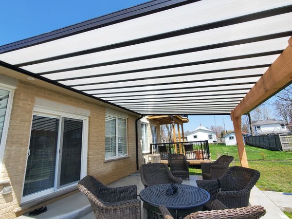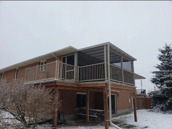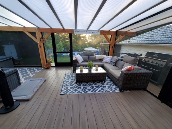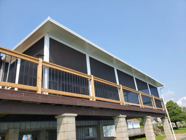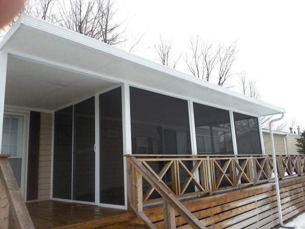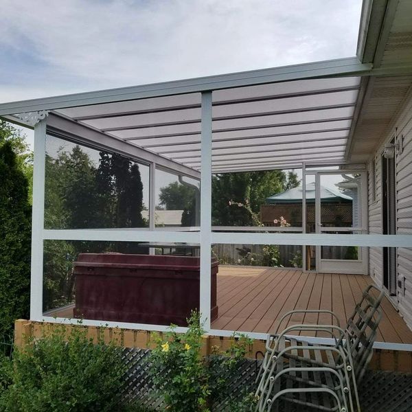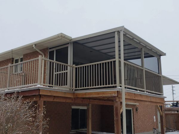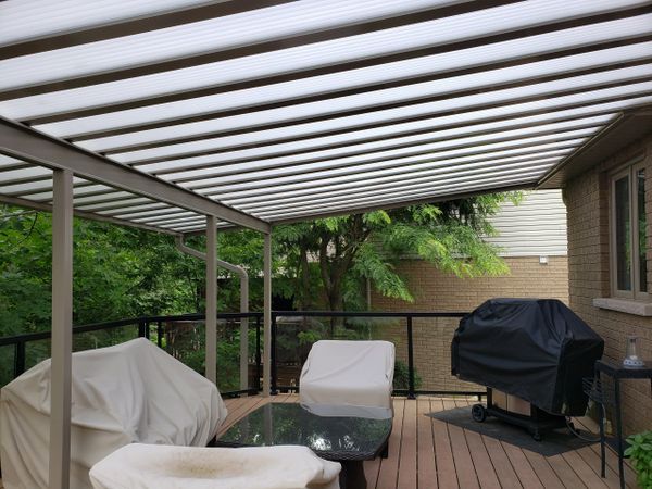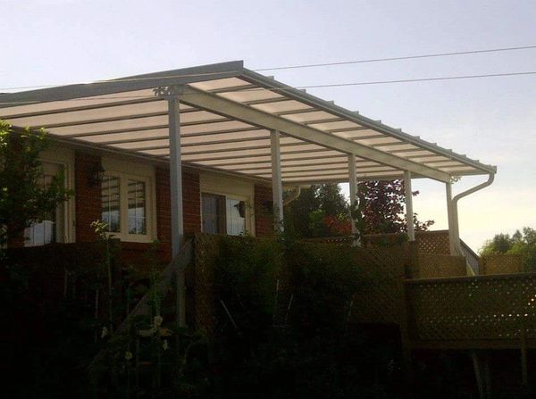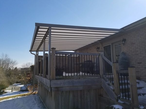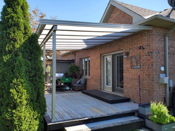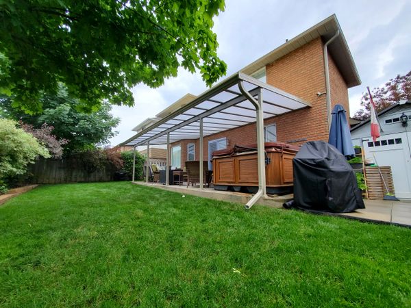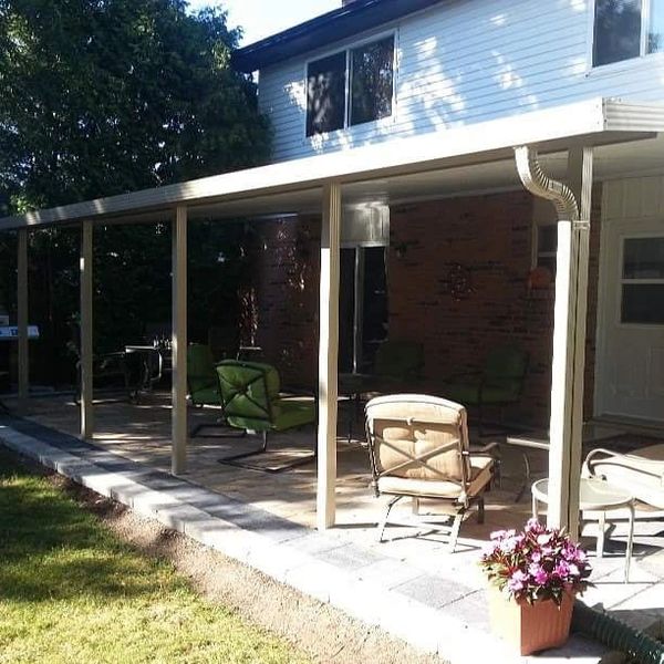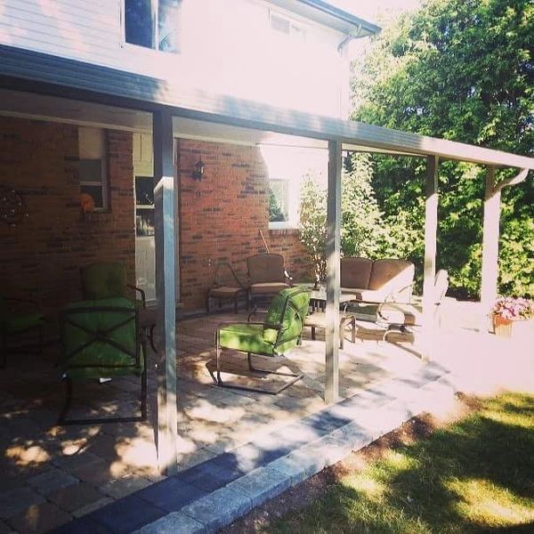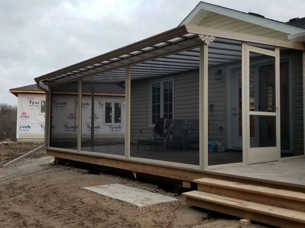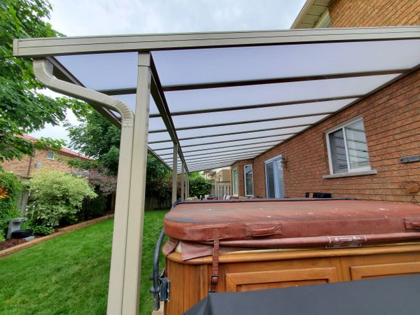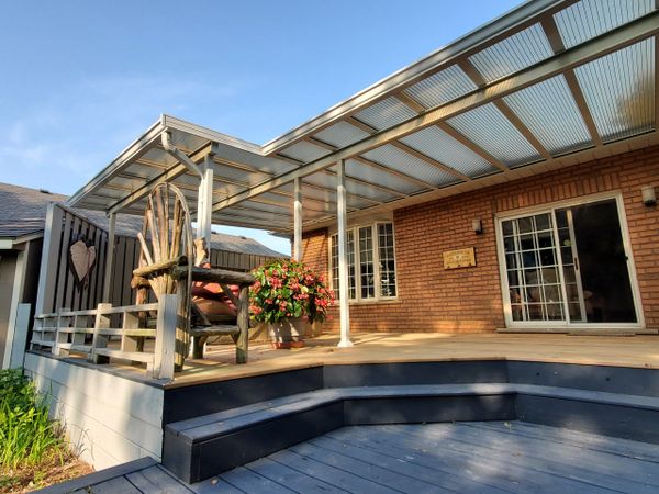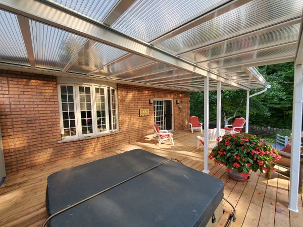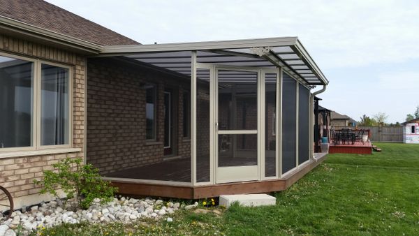 Our hard top patio covers provide a bright room with a white ceiling and multiple colour options for the trim. We can use the patio cover as a stand alone cover or we can screen them in or build them into a sunroom.