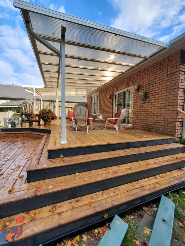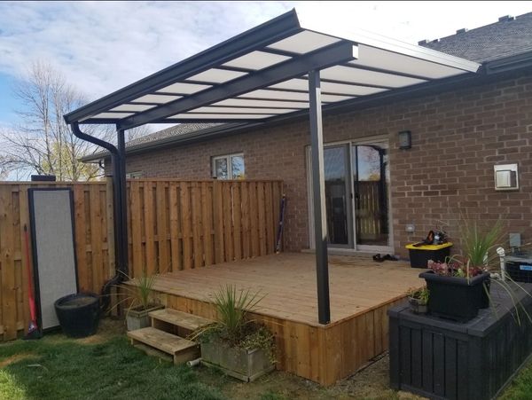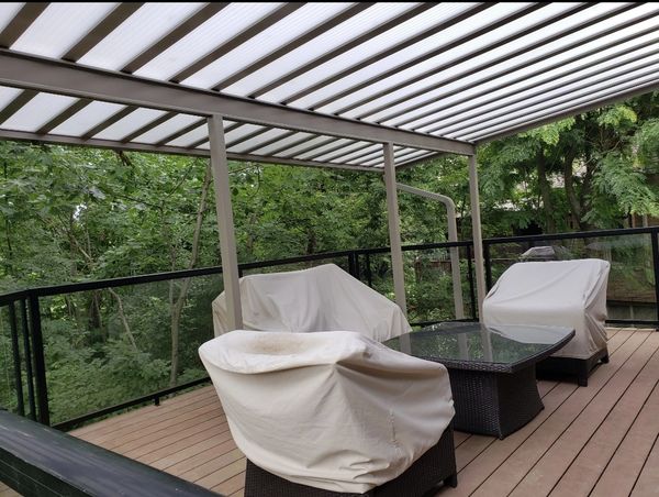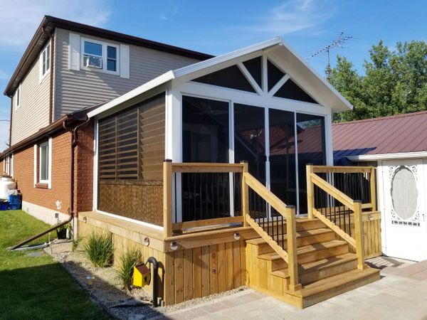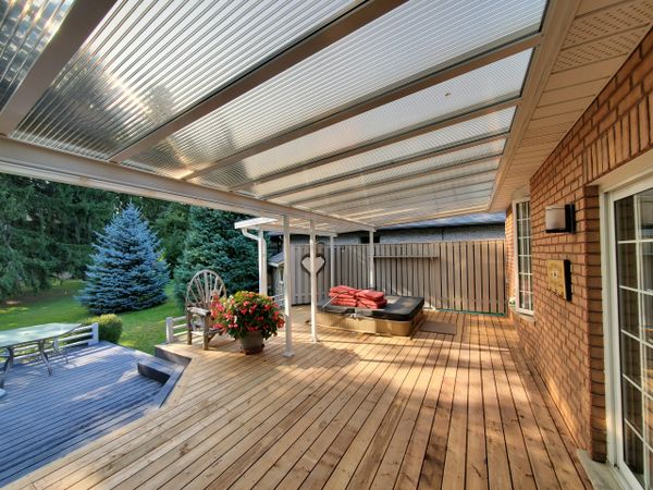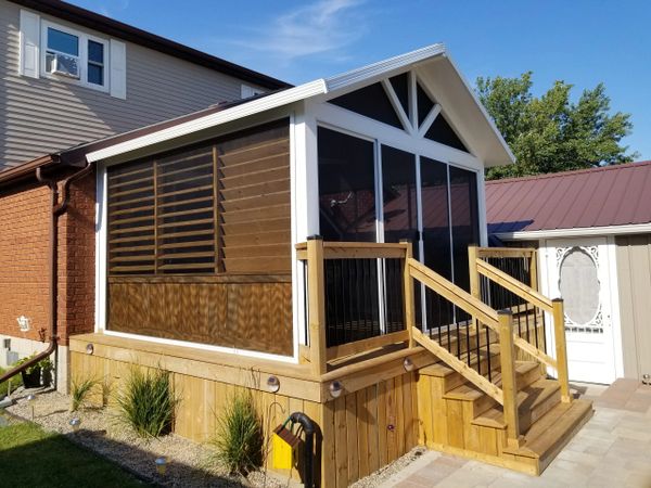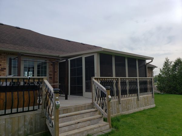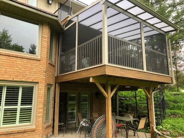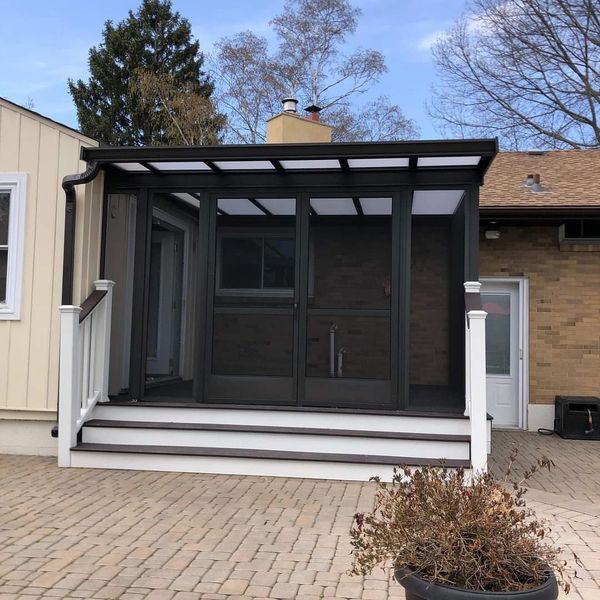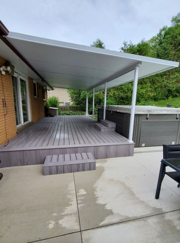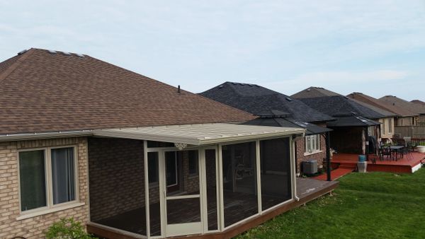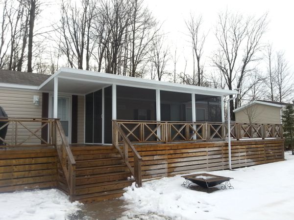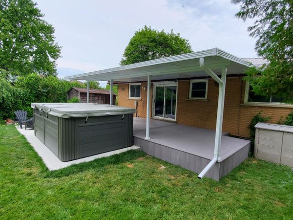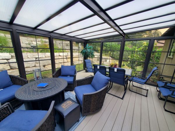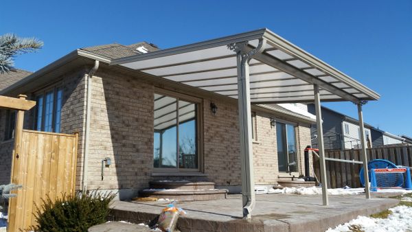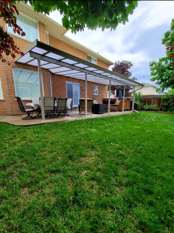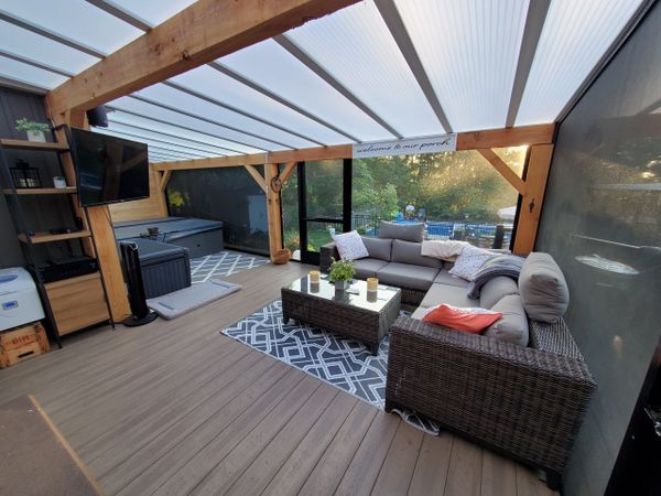 Our hard top patio covers provide a bright room with a white ceiling and multiple colour options for the trim. We can use the patio cover as a stand alone cover or we can screen them in or build them into a sunroom.